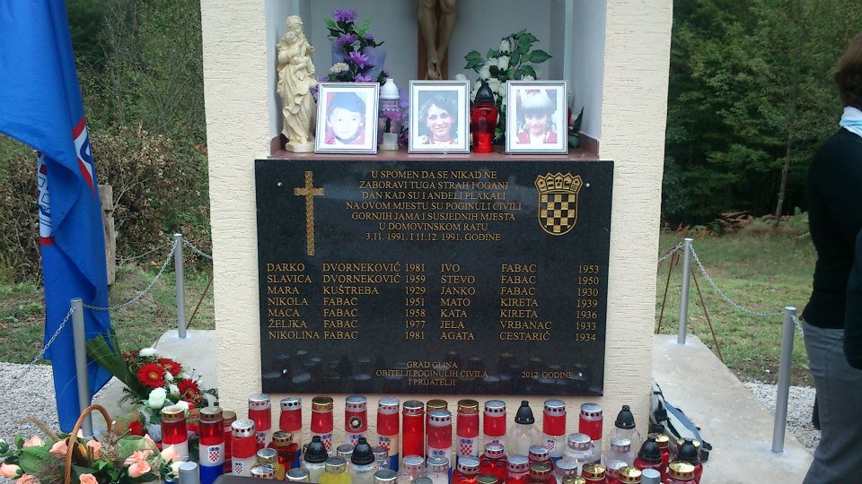 “…A crime was committed here for which no one has yet answered. In this place 14 civilians were murdered with 3 children among them, and they are Nikolina Fabac, Zeljka Fabac, and Darko Dvornekovic, who had not even reached the age of 10. Murdered, massacred and burned with the rest of the civilians whose names are engraved on this remembrance plaque.