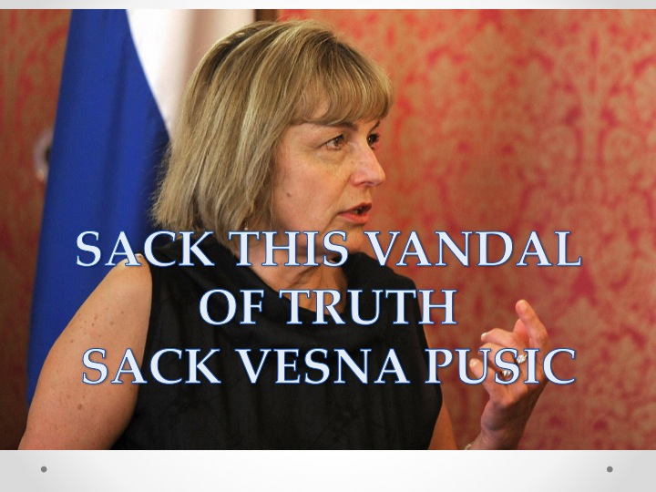 Statements and actions served upon justice and truth (let alone upon Croatian people/not those who pretend to be Croatian at heart as well as origin) by the Croatian foreign affairs minister and first deputy prime minister Vesna Pusic on her recent visit to Serbia are the stuff SICK and TREASONOUS are made of, in my book and in the book of many!