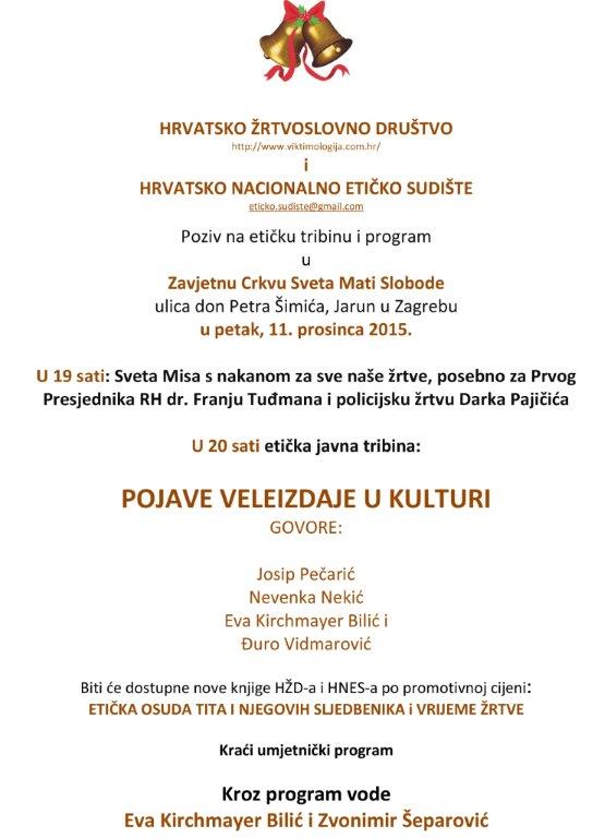Friday 11 December 2015 at 7 p.m. a Mass will be consecrated for all our victims, especially for the first president Dr Franjo Tudjman and the victim by the hand of the police Darko Pajicic. At 8 pm there will be an ethical panel on the topic of