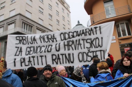 Banner says: “Serbia must answer for genocide in Croatia