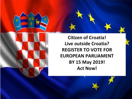 Registration to vote expires on 15 May 2019 (hence, register before that date)in order to be able to cast your vote for European Parliament representation to be held on Sunday 26 May 2019 on the premises of your closest Croatian consular or diplomatic office/mission.