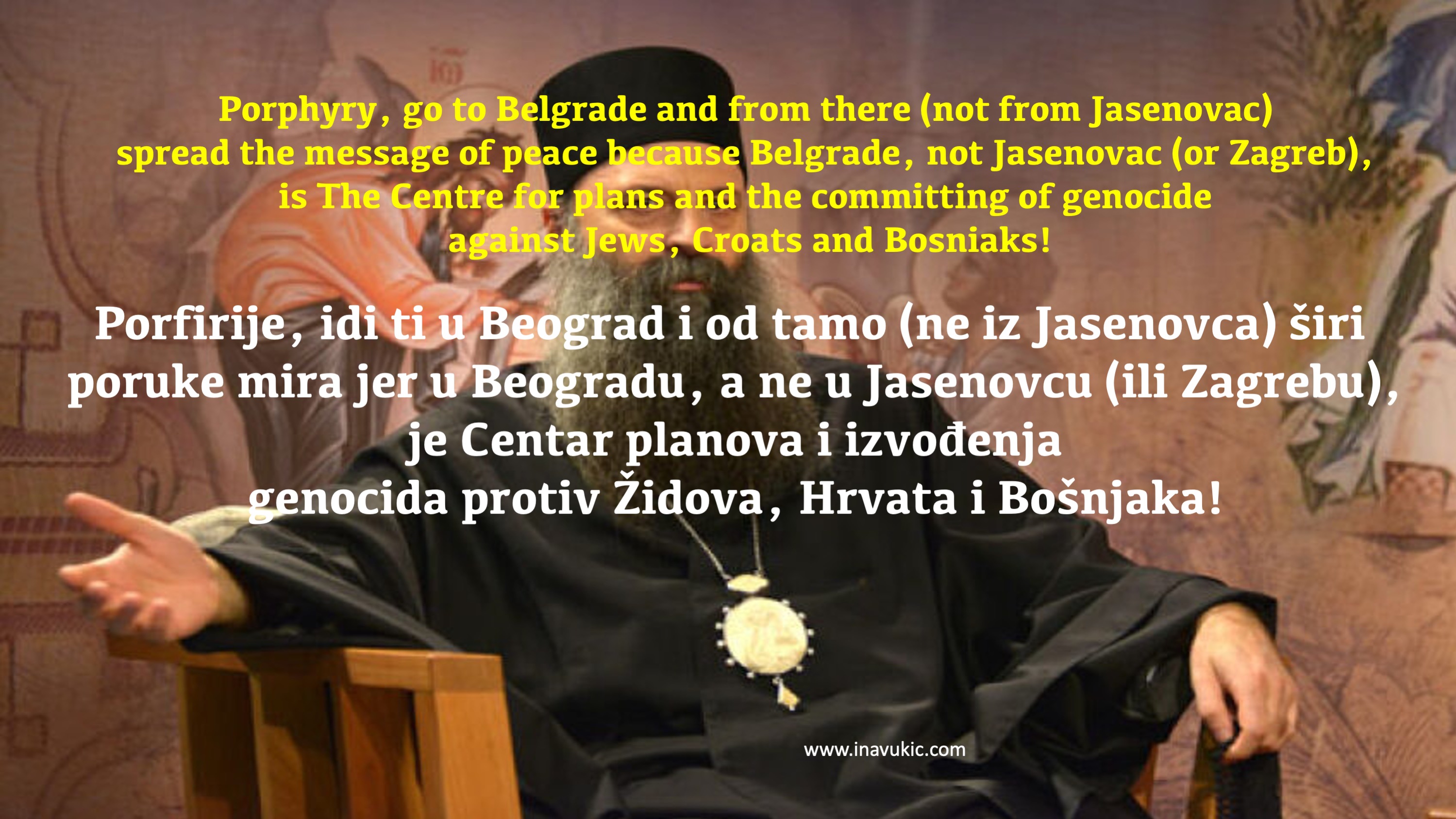 Given that WWII Serbia was among the first European countries to declare itself “Jew Free” or “Judenfrei” (May to August 1942) by exterminating some 94% of its Jews, given that it was Serbia that attacked Croatia and Bosnia and Herzegovina in the early 1990’s and committed acts of genocide in both countries, Porphyry would have done justice to humanity had he said that Belgrade (not Jasenovac in Croatia) should be the places from where messages of peace should be spread. But no, this he will not say because the Serbian Orthodox Church is the guiding “light” on the path to Serbia’s fabrications of history and its denial of its own horrendous crimes on other countries’ territories.