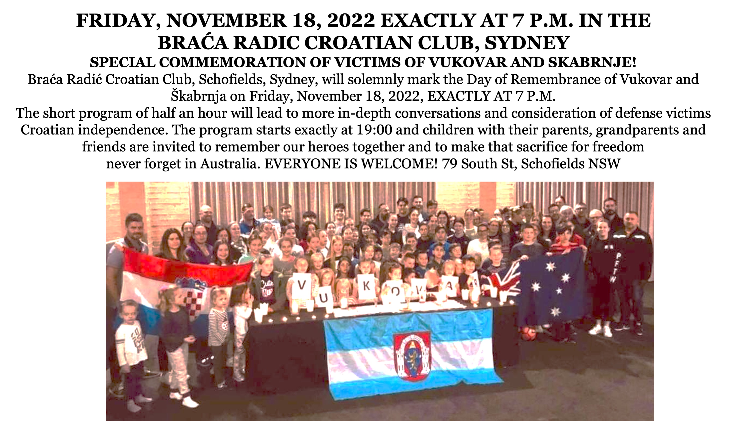 On 18th November commemoration to honour the victims of brutal, genocidal, Serb and Yugoslav Army aggression will be held across Croatia and particular focus will be on Vukovar and Skabrnja who on that day in 1991 and days that followed suffered horrific destinies at the hand of the aggressor while the “world” via the UN pressed on with arms embargo against Croatia! I was particularly touched recently of the announcement from the Sydney, Australia, based Croatian Club “Braća Radić” (Radic Brothers) that they will hold a special commemoration on Friday 18th November in the evening for Vukovar and Skabrnja massacres victims, focusing on including school-age children to participate in this event – so that future Australian-Croatian generations know about these tragedies and never forget the victims. The children, parents and friends will confirm their knowledge and remembrance of significant milestones of these tragedies and places in Croatia. It will include the following lines of truths that will be useful for your children and grandchildren to know: