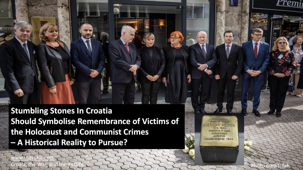 On the chilly autumn morning of 25 October 2023 in the capital of Croatia, Zagreb, several residents, or rather leftist or pro-communist Yugoslavia political activists some of whose immediate family members were brutal aggressors and ethnic cleansers against Croats during 1990’s war of aggression, former President Ivo Josipovic and a handful of politicians of Serbian extraction, viz Milorad Pupovac and Boris Milosevic of the SDSS/ Independent Democratic Serb Party, as well as handful individuals evidently aligned with the communist past, huddled together on the pavement just outside the Hotel Dubrovnik that is situated on corner of the Ban Jelacic Square and Gajeva Street, to commemorate Svetozar Milinov and his family with the installation of a remembrance stumbling stone (or block). A Croatian Serb Svetozar Milinov was the original owner of Hotel Dubrovnik and he and his family were reportedly among the first Serbs killed in Croatia (1941) by the Ustashi regime and their deaths are considered by some political servants to be a part of the Holocaust. Indeed, it can safely be assumed that those present at this commemorative installation of a stumbling stone and those behind it are among those.