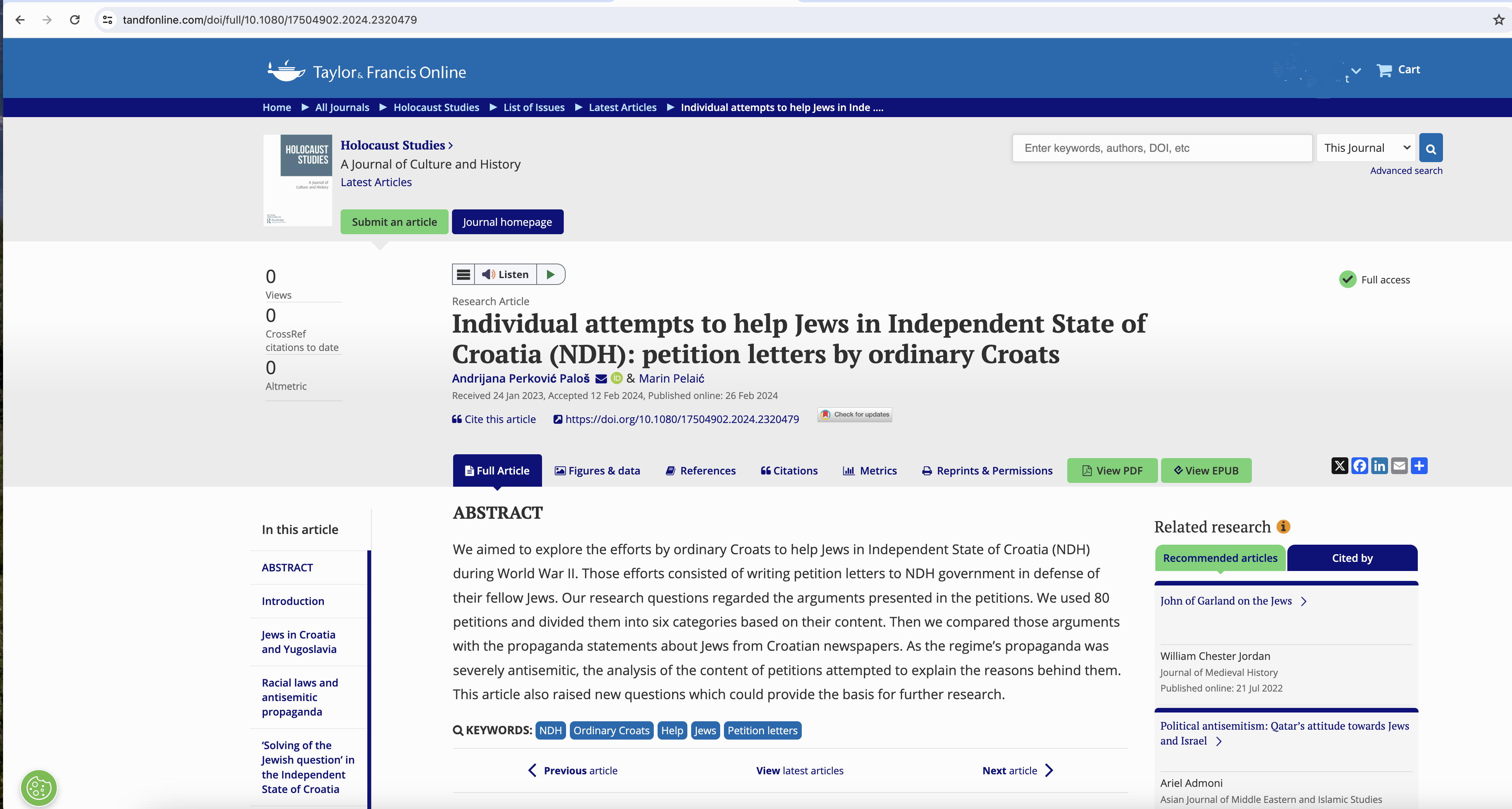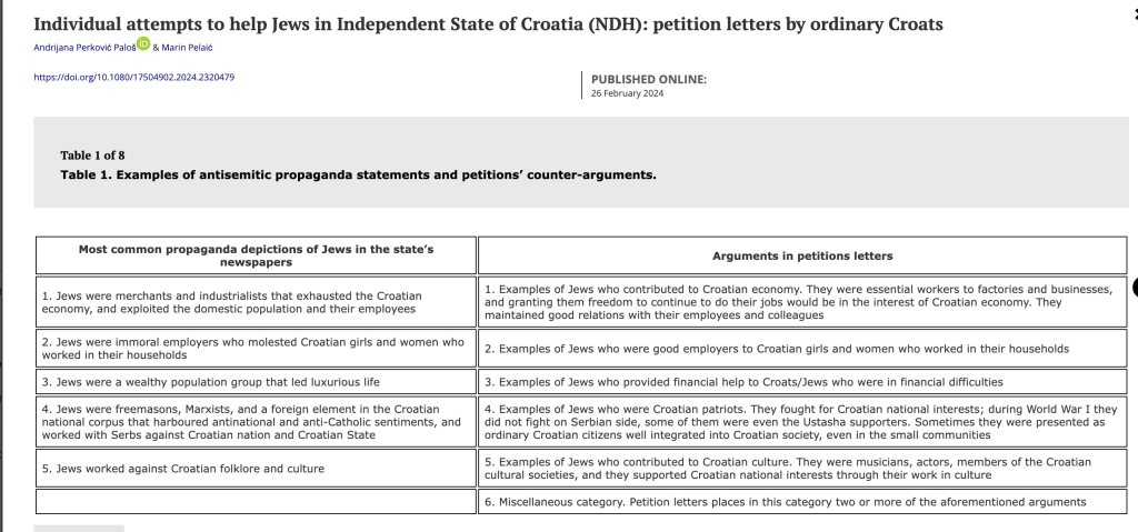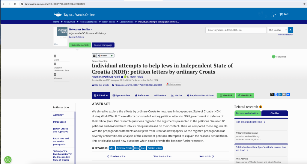 During the past fortnight a new research-based overview Academic Paper of efforts in the rescue of Jews on the territory of Independent State of Croatia by Andrijana Perkovic Palosa and Marin Pelaic has been published under the title “Individual attempts to help Jews in Independent State of Croatia (NDH): petition letters by ordinary Croats” by Routlege (Taylor and Francis Group) within their realm of Holocaust Studies. This very engaging and compelling paper may be accessed via this link.