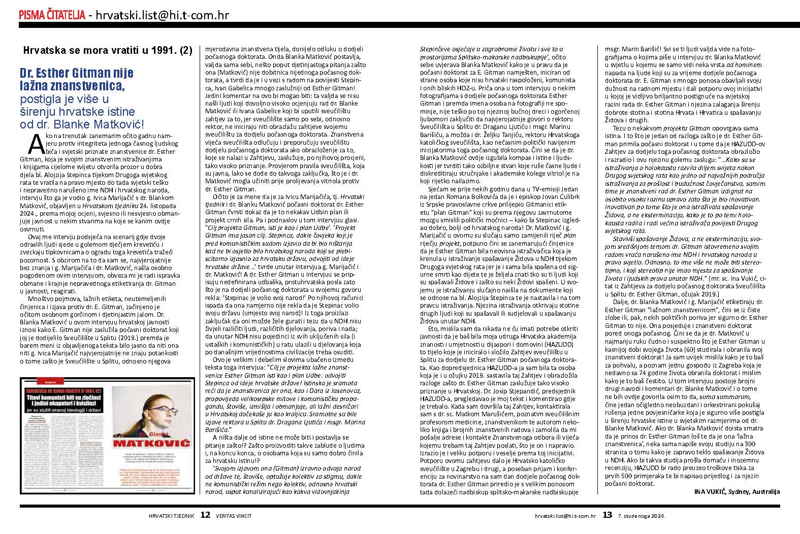 Furthermore, dr. Matkovic and Mr. Marijacic label in the interview dr. Esther Gitman a “fake scientist”, and this would seem to have arisen out of pure malice or some unclear political urges because dr. Gitman is no fake. On the contrary, dr Gitman is as a genuine scientist and reputable historian as one can come across. She holds a scientific doctorate (PhD) in addition to the honorary one. It seems that to dr. Matkovic it is strange and suspicious, to say the least, that Esther Gitman studied and defended her scientific doctorate at a later age in her life (60)! I have always thought that this is something to be commended, and I know a lady from Zagreb who recently defended her doctorate at the age of 74, and I think that is very honourable. In that interview, there are numerous other statements and comments by dr. Blanka Matkovic and I would not like to talk about that here, except that, summa summarum, they are making an obviously unbridled and orchestrated attempt to destroy a historian who has certainly achieved more in spreading the Croatian truth on a global scale than she (Matkovic) herself, or many others for that matter. If dr. Blanka Matkovic really believes that the contribution of dr. Esther Gitman is not that good and that she is a “fake scientist”, let her (Matkovic) write her own 300-page study on how the rescue of Jews in the NDH actually went. If such a study were to pass domestic and foreign peer review, HAZUDD would be happy to cover the printing costs for the first 500 copies and write a proposal for an honorary doctorate. Ina Vukic