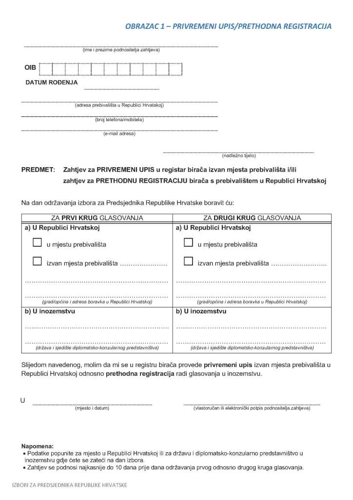 - Temporary entry of their name (privremeni upis) in the electoral roll outside the place of residence (voter who has a permanent residence in the Republic of Croatia and wishes to vote outside the place of residence in the Republic of Croatia) – i.e. register for absentee vote within Croatia. (Form below may be printed and forwarded as instructed to nearest appropriate Croatian authority.)