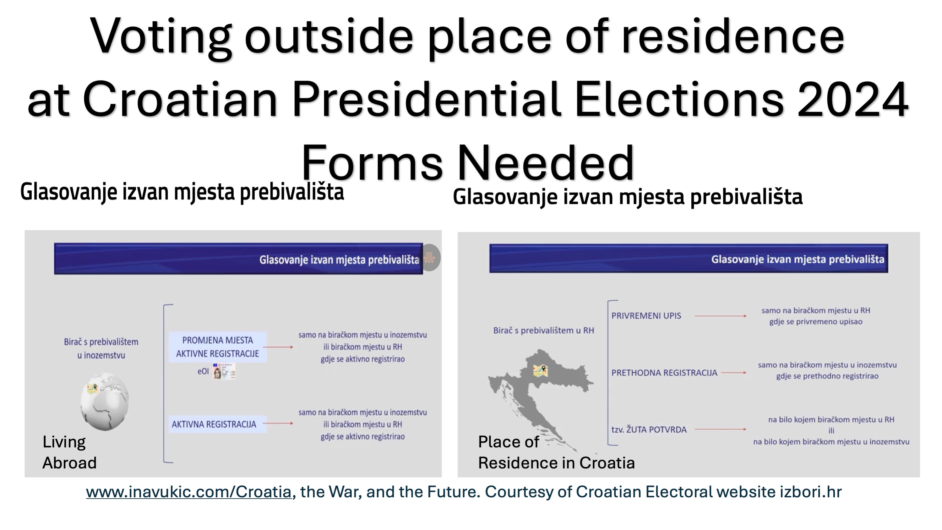 Voters who have a Croatian identity Card permanent residence address in the Republic of Croatia on it and wish to vote abroad must submit a “prethodna registracija”/ registration in advance form/ form to vote outside of their place of residence as indicated on their identity card. So, for example, you hold a Croatian identity Card and on that card your address is in Spit, Zagreb or anywhere in Croatia and you will be outside of Croatia, in Canada, Australia etc where you usually live, you must register in advance to be able to vote outside of Croatia.