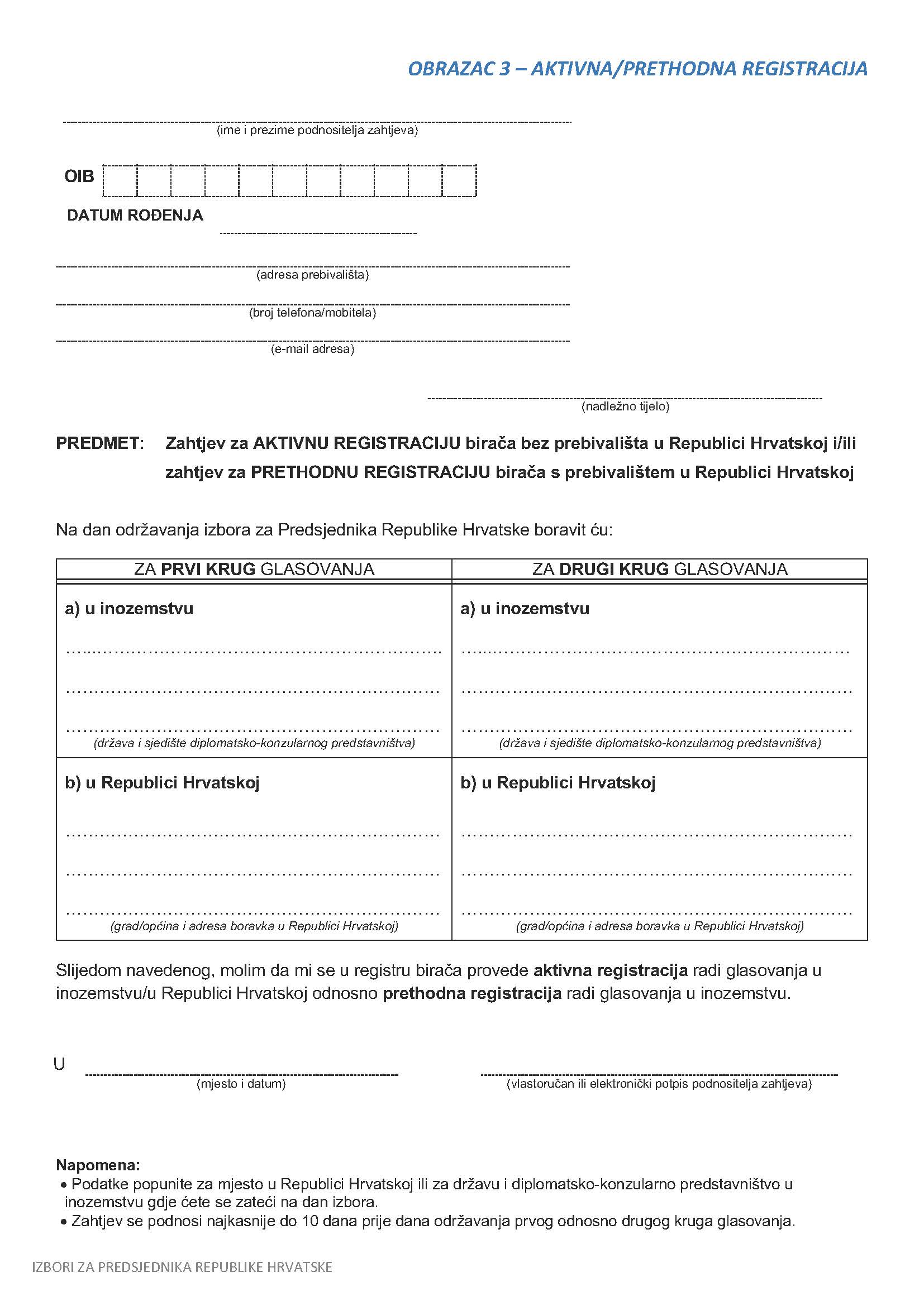 - Lodge and active registration (aktivnu registraciju) if you do not have a permanent residence in the Republic of Croatia and wish to vote abroad or in the Republic of Croatia. You must attach your photo ID with this application, e.g. photo of Passport or photo driver’s licence etc. (Photo of Form below may be printed, filled in and together with photo ID emailed to your nearest Consulate or Embassy or Republic of Croatia or to competent authority in Croatia if you are, for instance, holidaying in Croatia during elections).