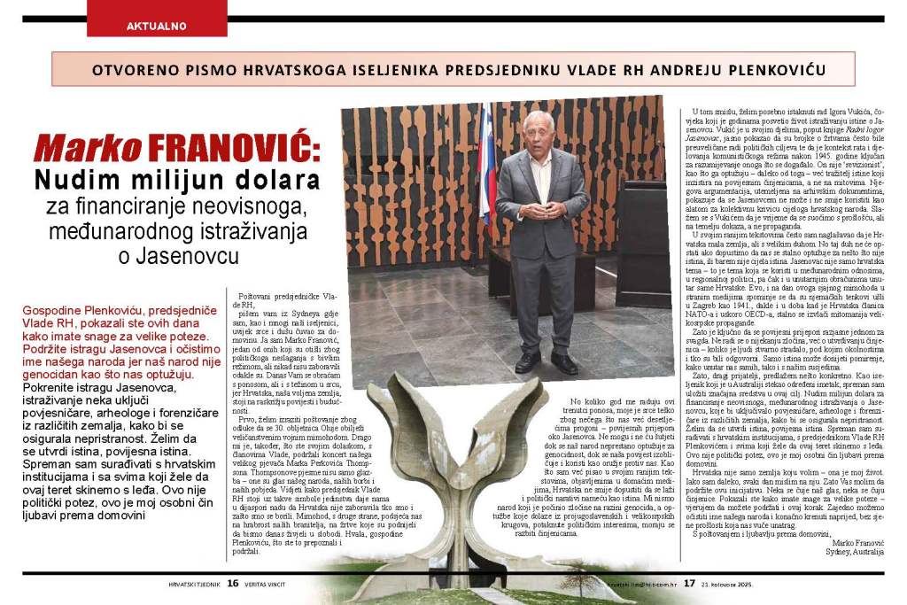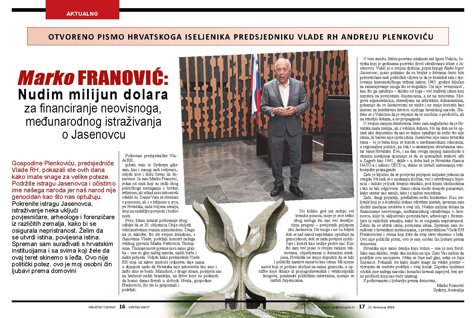 Open letter to Prime Minister of the Republic of Croatia from Marko Franovic in the Croatian language as published in Hrvatski tjednik 21 August 2025: