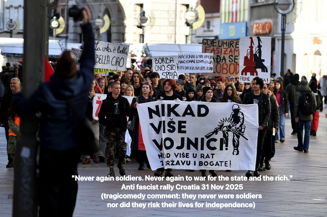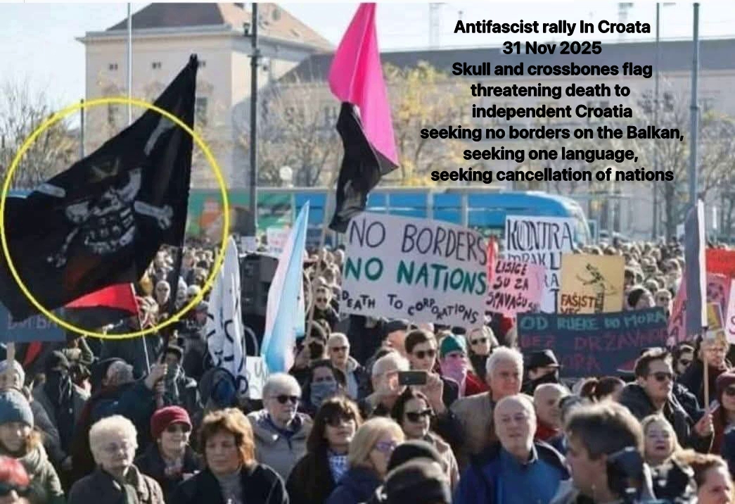 In 1991 Yugoslavia was blown into smithereens and with almost 94% of people votes at referendum Croatia declared independence from communist come socialist Yugoslavia, but not without horrendous Yugoslav Army aggression, led predominantly by Serbs, that turned into a most bloody war out of which Croatia emerged victorious. Former communists and their loyal followers were never going to take the defeat lightly; their persistent hatred of that Croatian Homeland War victory, their persistent amassing of lies against Croatian independence and those who fought for it culminated on Sunday 31 November 2025 in a series of “anti-fascists against fascists” rallies in four cities in Croatia. A similar show for the world Tito staged in 1948. The rallies had nothing to do with anti-fascism or fascism, because neither exist in earnest in Croatia, but had everything to do with attempts to crush the independent state of Croatia, glorifying the former Yugoslavia. Multitudes of flags of former Yugoslavia at the rallies!